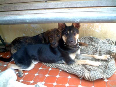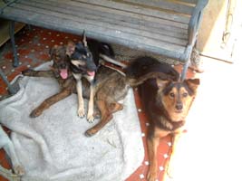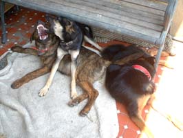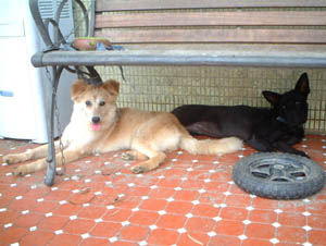 暑いのでみんなベンチの下に来たがります。子犬が集うとガウガウ遊びが始まります。いい顔しろ、と声をかけたら
