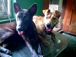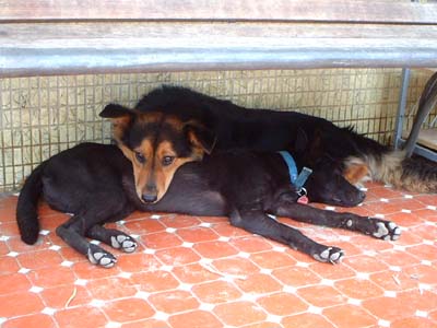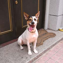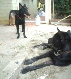 AT台中支部からやってきた、新入り子犬のシャネル(奥)です。見た目がいいので貰い手がつく可能性が高いだろうと思ったらところがどっこい、超ハイパーでひと時も目が離せず、困ったスタッフがAT台北に助けを求め、AT台北事務所の長老格・ミスター&ミセスと交換した、という札付きの犬です。とても美しくて陽気で人好きなので、競技犬に向いていると思うんですが、それは飼い主さんがよい先生であればの話。現在事務所で更生中です。