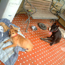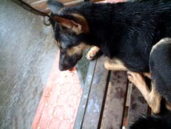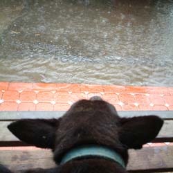 ずぶぬれといえば、最近スコールがありますね。犬たちは雨が降るとテンションが下がります。こんなふうに。