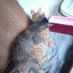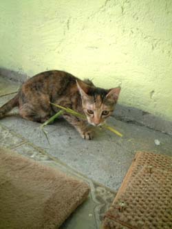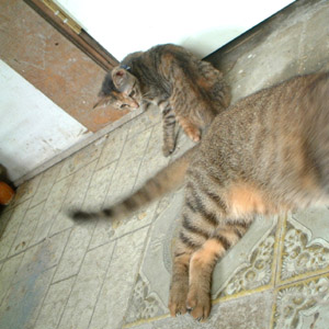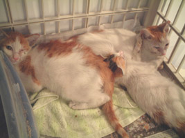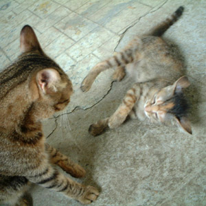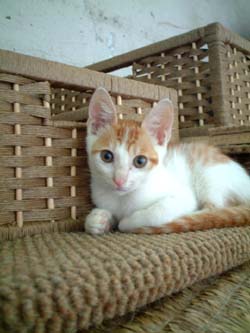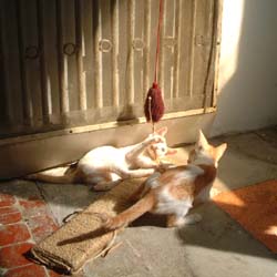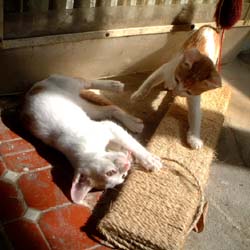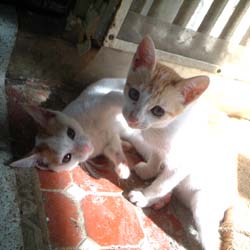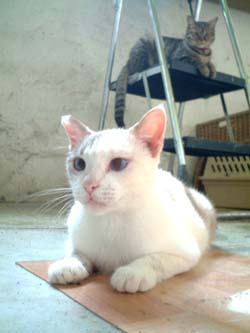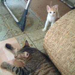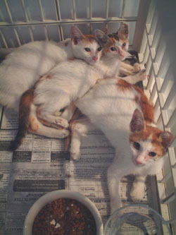 そうそう、新入りの子猫が3匹います。茶虎が美しいちょっとシャイな若い子猫と、白地に黄のきょうだい子猫が3匹です。お兄ちゃん子猫が特に愛らしい顔つきで、強力推薦です!