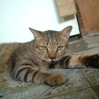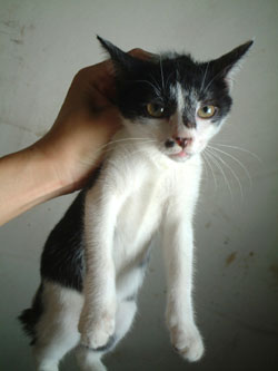 彼は額(ひたい)ヒロシ君です。勝手にそう呼んでいるだけですが。下あご(唇)の形がおかしいので、ちょっと変わった顔に見えます。オスらしい立派な顔つきをしていますが、とってもフレンドリーで、子ネコと遊び狂うやんちゃな性格です。