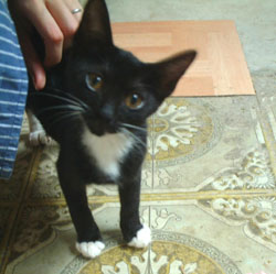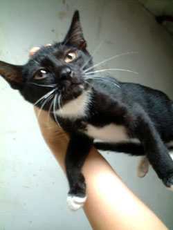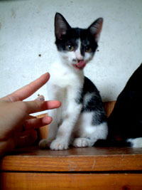 彼女が4匹の子猫のなかで一番ひとなつこいのですが、おすすめする理由はそんなことではございません。ご覧くださいこの芸術的なまでの黒と白の配分!漆黒の闇を思わせるつややかな毛並み!しゃがんで作業をしていると、ニャーとかわいい声で鳴いて、ひざに乗ってくるのです。たまりません。早い者勝ちです。里親希望の方はいますぐご連絡ください。