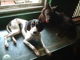 顔を上げるのもダルいフレッドさん(上)と、テーブルの上でニコニコ寄り添うホーキンス(黒)とタイガー(茶虎)。ホーキンスはいつもロングジョーンという三本脚犬といっしょにいますが、最近だいぶひとりでも動けるようになってきました。ロングジョーンさえリードにしておけば、ホーキンスはノーリードでも大丈夫なくらい、黒子のようについてまわっています。男同士なんですが。