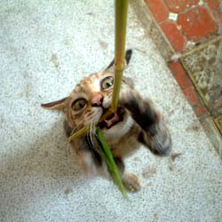 事務所の庭に生えている竹の枝が落ちていたので、こういうのネコが好きだよねーと思って持ち込んだところ、