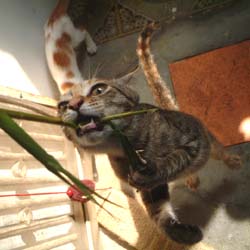 遊ばせながら写真を撮っていたら、油断していて枝の先を折られてしまいました。するとさびネコは折れた枝の先を咥えたまま、枝本体に挑むのでした。夢中になりすぎて枝の先を離せないのです。