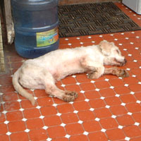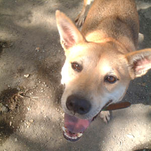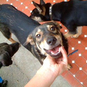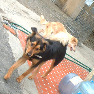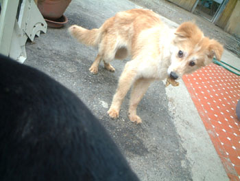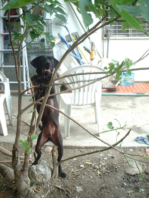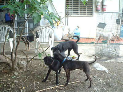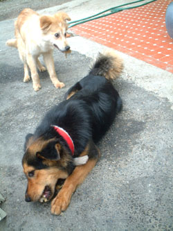 これはマンゴを咥えているのです。運動場にマンゴの木がありまして、その実が勝手に落ちるのか、犬が根性で取るのか、よく誰かが咥えて歩いています。この日はジャスパー(手前)とモモ。