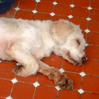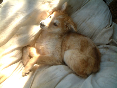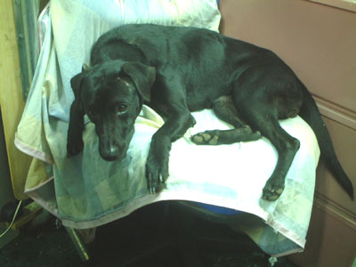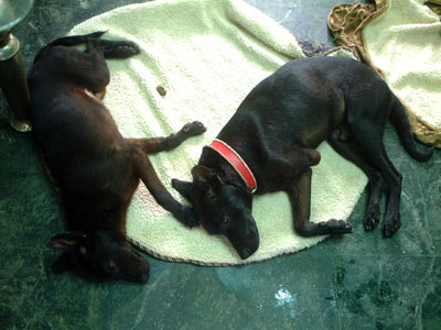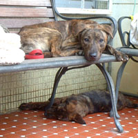 ロングジョーンは3本足。まだ子犬のホーキンスは切断は免れましたが前足の片手の肉球を損傷しています。ふたりとも海辺の農家の跳ね罠にやられました。地元で知り合いだったのか、ホーキンスは誰にもなつかないのにロングジョーンにはべったりです。男同士なのに。ホーキンスを動かしたかったらロングジョーンを動かせばいいのです。