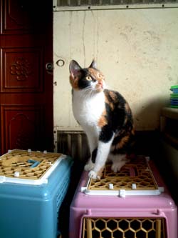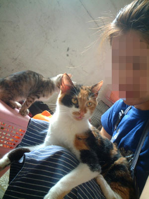 新入りの子猫の写真を撮ろうとした私の膝に当然のように乗ってきた美人三毛さんは、AT ネコ部屋のナンバーワンです。実は飼い主さんがすでに帰国されていて、検疫期間を台湾で終えるためにAT に預けられているのだそうです。納得の人懐こさ。もうすぐ飼い主さんのところへ行けるそうです。背後に見えるのは…