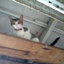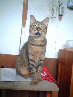 口のつくりがなんだかおかしい、味のある顔をしたくしゃみ男です。彼も古参です。とってもフレンドリーなのですが、人前で用を足すのが大好きというマニアックなネコです。ため息をつきながら用を足すネコをわたしは初めて見ました。