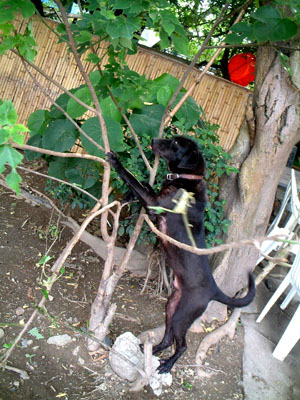 枝の先の葉っぱを楽にもれなく食べるための知恵だったのですえね。ほかの犬が、自分は手を下さないくせになにをやっているのか察して寄ってきて、漁夫の利を得るところが興味深かったです。背後にシャイなリナちゃんがいるところにも注目です。