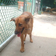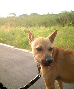 エルビスは、淡水・白砂湾で跳ね罠にかかって手が腐っていたところを保護されました。肉がすっかりえぐれて、手首の骨が見えるほどのひどい状態でした(彼のレスキュー時の様子はSean の日記に詳しいです)。手術や処置を終えて事務所での生活を始めた頃はいつも怯えていて、怖くて攻撃することさえできない様子が痛ましかったです。スタッフやボランティアの方々と接するうちに、人間は自分を傷つけないと知ったのでしょう、最近ではニコニコしています。三本脚でもお構いなしに明るい表情がとてもかわいらしい、穏やかなワンちゃんです。コリーが混じっているような、上品な顔つきもステキ。