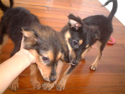 子犬のジャスパーとその兄弟。ひとりは新しいおうちに貰われました。なんちゃってダックスな毛色がかわいいです。子犬なのでフカフカなんです!こんなのが甘えて膝の上で丸くなるんだからたまりません!!!