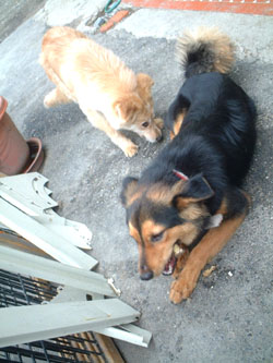 これはマンゴを咥えているのです。運動場にマンゴの木がありまして、その実が勝手に落ちるのか、犬が根性で取るのか、よく誰かが咥えて歩いています。この日はジャスパー(手前)とモモ。